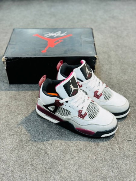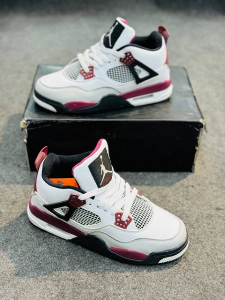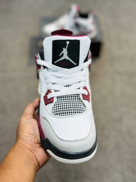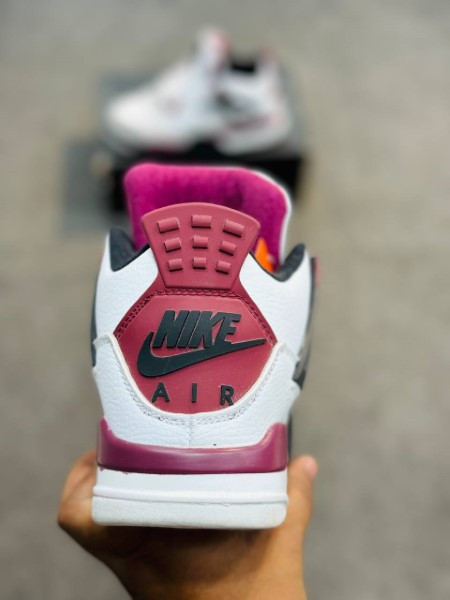 The Jordan 4 PSG features traditional color-blocking that is reminiscent of the classic Fire Red 4. White leather comprises the upper while grey nubuck paneling encompasses the toe wrap. Bordeaux purple and black coat the signature rubber wings, lace cages, and midsole. Finishing details include a "PANAME" text label on the lateral forefoot concluded with a "PSG" badge on the rubber heel tab.