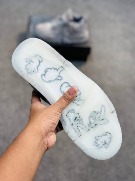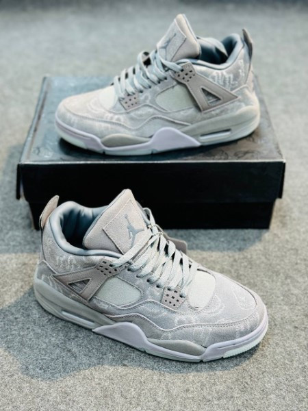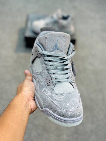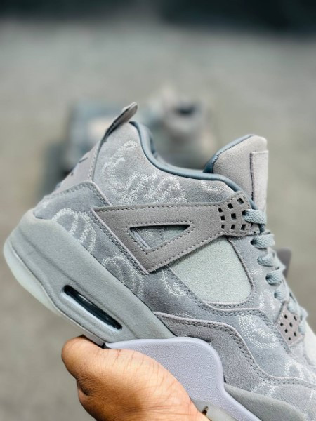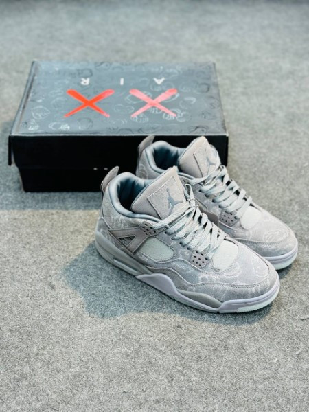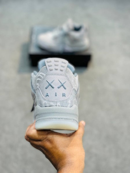 The KAWS x Air Jordan 4 features a buttery premium suede upper in smooth and heathered textures, all drenched in a tonal grey colorway. KAWS hand graphics are etched into the upper as well, along with the matching hang tag. The midsole and upper “Wings” are also wrapped in suede.